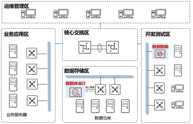 針對該公司需求,本次項目建設部署一套數據庫審計系統和一套數據脫敏系統,數據庫審計系統部署在數據存儲區,通過交換機鏡像端口引流至數據庫審計系統進行協議解析還原;數據脫敏系統部署在開發測試區,通過直連數據倉庫進行數據抽取、脫敏最終裝載至開發測試服務器,部署架構如下圖所示: