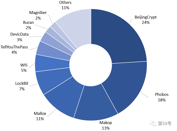 下圖是美創(chuàng)第59號(hào)實(shí)驗(yàn)室對(duì)勒索病毒監(jiān)測(cè)后所計(jì)算出的11月份勒索病毒家族流行度占比分布圖。BeijingCrypt、Phobos、Makop三大勒索病毒家族的受害者占比最多。