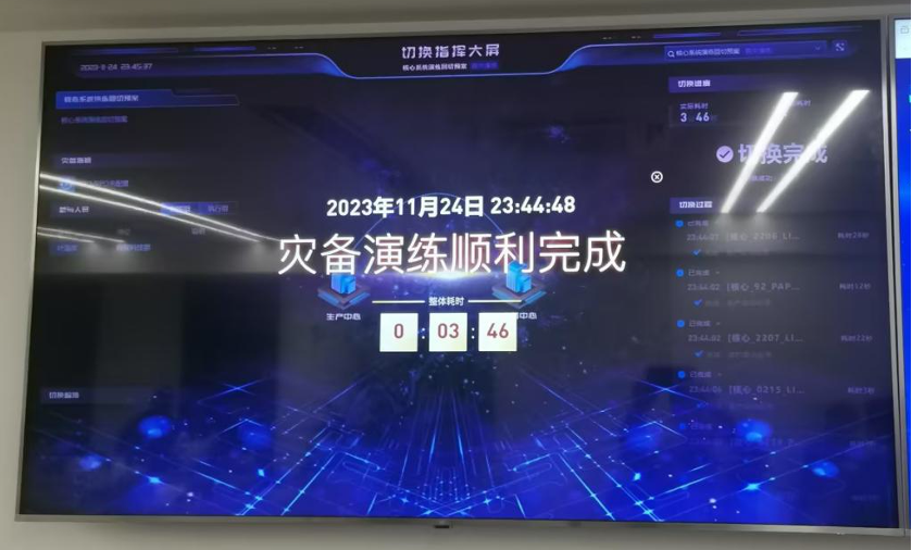 切換后,業務人員充分驗證異地災備系統的數據完整性和業務可用性,執行小組于當晚23點41分進行一鍵業務回切,僅耗時3分46秒完成業務恢復。