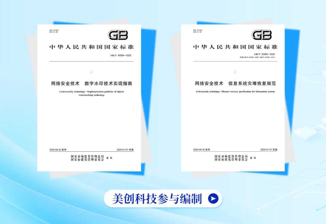 美創(chuàng)科技深度參與編制的兩項國家標(biāo)準(zhǔn)GB/T 20988-2025《網(wǎng)絡(luò)安全技術(shù) 信息系統(tǒng)災(zāi)難恢復(fù)規(guī)范》、GB/T 45909-2025《網(wǎng)絡(luò)安全技術(shù) 數(shù)字水印技術(shù)實現(xiàn)指南》,于2025年6月30日正式發(fā)布,并將于2026年1月1日起正式實施。