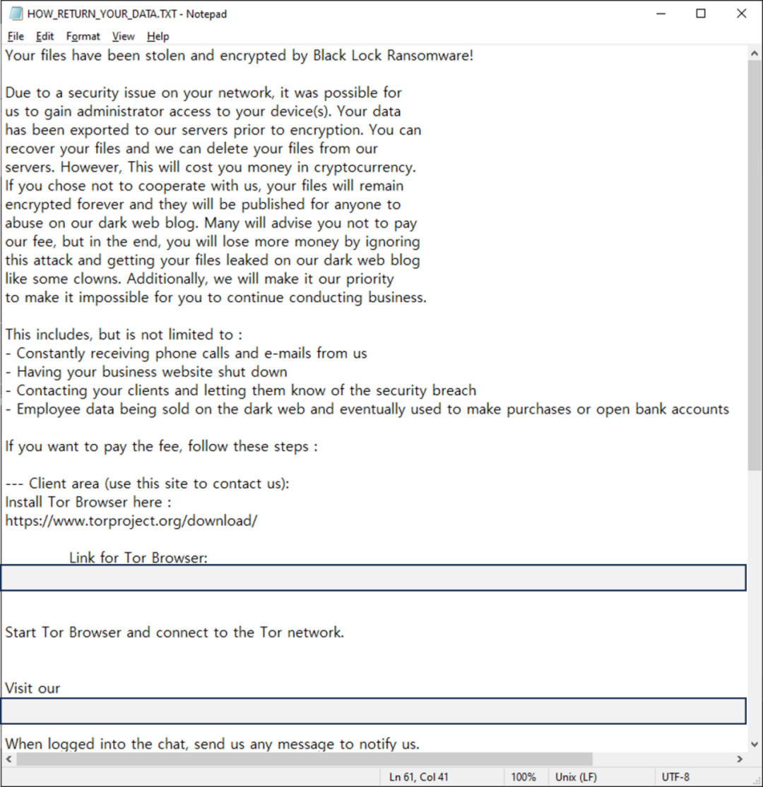 BlackLock是一個相對較新的勒索組織,成立于2024年3月左右。該組織最初使用的名稱為“El Dorado”,并于2024年9月左右更名為“BlackLock”。BlackLock勒索軟件用Go語言開發,該勒索軟件似乎有一個針對VMware虛擬化平臺ESXi的功能,即名為-esxi的參數。然而,研究人員在分析的樣本中發現該參數的實際功能并未實現。該勒索軟件為每個文件生成一個獨特的加密密鑰,并使用一個共享密鑰進一步對這些密鑰進行加密。被加密的文件會被添加隨機的擴展名,其釋放的勒索信名稱為“HOW_RETURN_YOUR_DATA.TXT”。在Windows環境中,BlackLock勒索軟件不僅攻擊本地驅動器,還會對SMB共享文件夾進行攻擊。