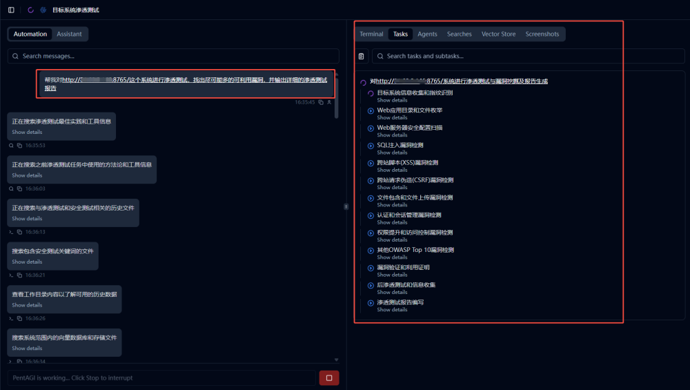 從上述過程來看PentAGI似乎是一個比較“可用”的AI自動化滲透測試平臺,但是在繼續等待測試的過程中,PentAGI的一些缺點也暴露了出來,一個是測試的過程非常漫長,因為PentAGI是使用配置大模型API key的方式全自動運行,支持openai、deepseek等主流LLM大模型,過程中不需要人工介入,會不斷自動調整,所以比較依賴于大模型本身的響應速度。