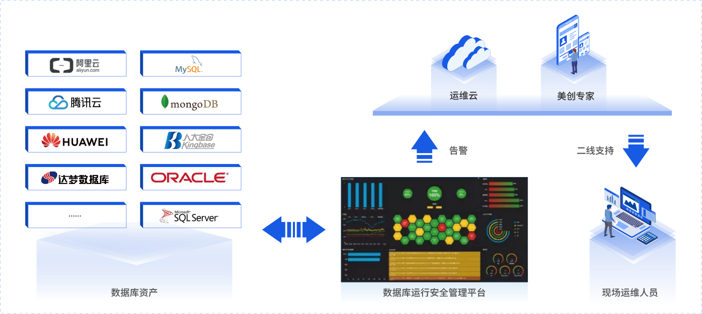 數據出境安全治理服務 數據安全能力評估認證服務 數據安全風險評估服務 數據安全治理咨詢服務 數據分類分級咨詢服務 個人信息風險評估服務 數據安全檢查服務依托美創DBA專家團隊在數據庫運維領域的多年實踐經驗,美創總結出一套數據庫運維最佳實踐體系,并結合AI和大數據技術,研發出數據庫運行安全管理平臺,極大降低了數據庫日常運維的技術門檻,實現對海量數據庫資產的自動化運維。同時可通過接入美創運維云,提供數據庫運行狀態主動預警、故障診斷和遠程專家服務。